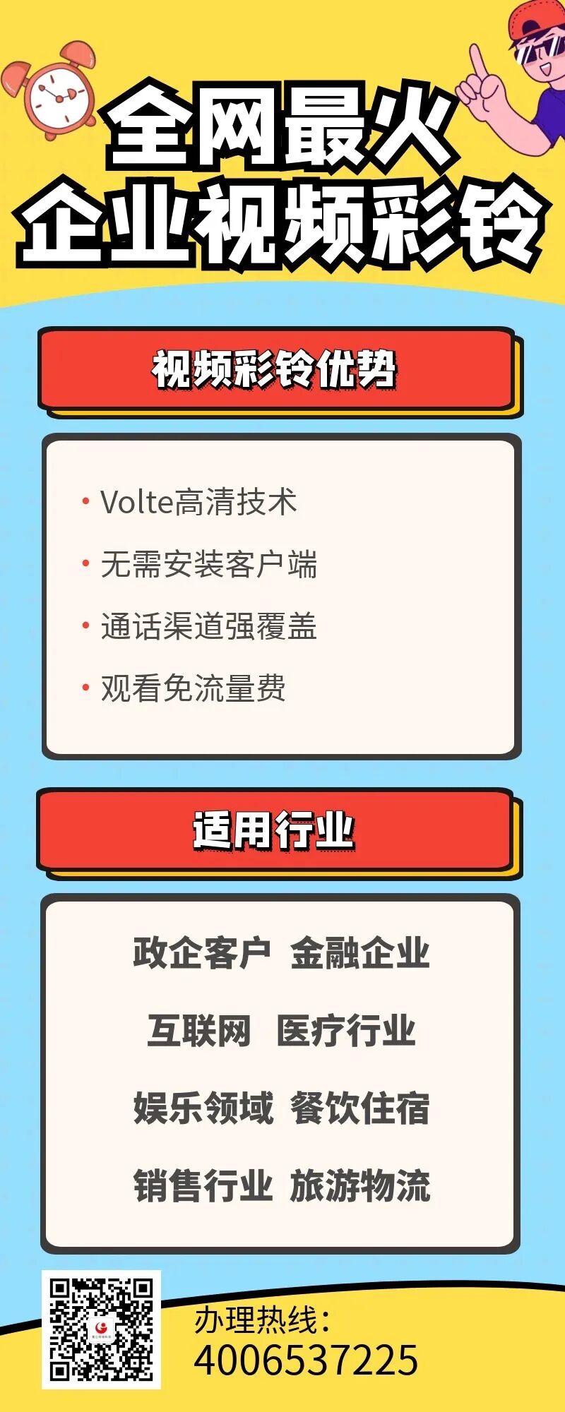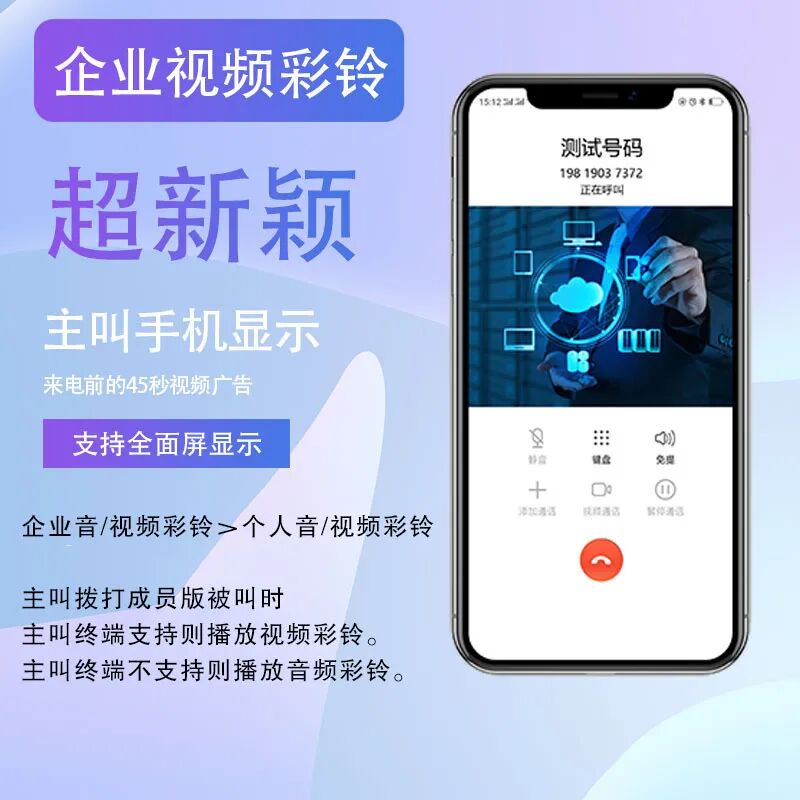 视频彩铃是VoLTE的特色业务,将"听的彩铃"演进成"看的彩铃"。用户在VoLTE网络下拨打语音电话或视频电话,呼叫接通前会看到一段视频内容。视频彩铃用户可以制作或上传个性化视频内容,或者从运营商的视频库中进行选择;针对不同主叫方还可以设定不同的视频内容。 企业视频彩铃——不一样的等待,不一样的精彩通话中播放短视频,让等待不再枯燥,将精彩尽情释放 基于VoLTE技术的企业视频彩铃,为企业客户带来颠覆性的宣传价值。 优先级: 企业音/视频彩铃>个人音/视频彩铃 主叫拨打成员版被叫时,主叫终端不支持则播放音频彩铃。 企业应用场景——新媒体、新广告、新名片全面开花 根据不同行业场景量身定制,满足企业精准营销宣传需求 488款终端机 3.2亿+用户量 覆盖政府/事业单位/金融保险/商超零售/互联网行业 5G高清视频彩铃——5G赋能,畅享高清极致体验,主要应用于党政宣传、热点宣传、新品推介、企业形象宣传、业务营销等行业场景。 测试号码:19819037372 [仅限移动号码测试] (苹果手机不支持,可放心拨打,此号码无人接听,仅供测试) 办理请联系客服 更多精彩,敬请期待 |
